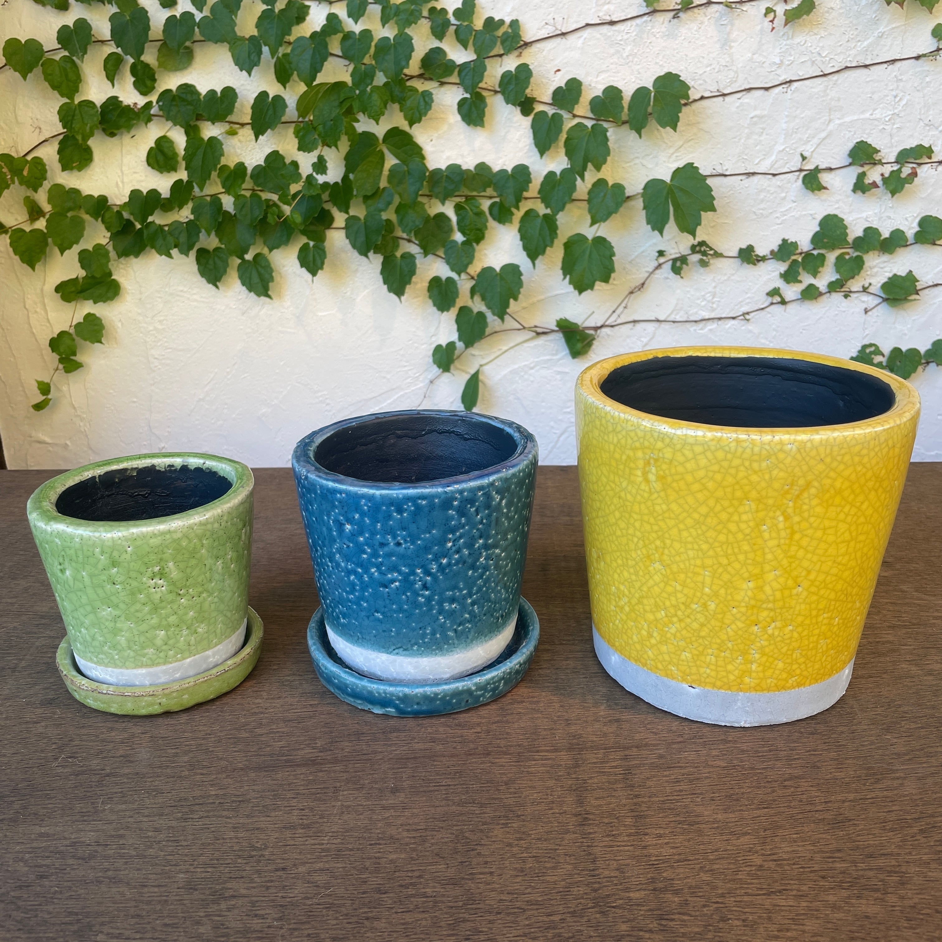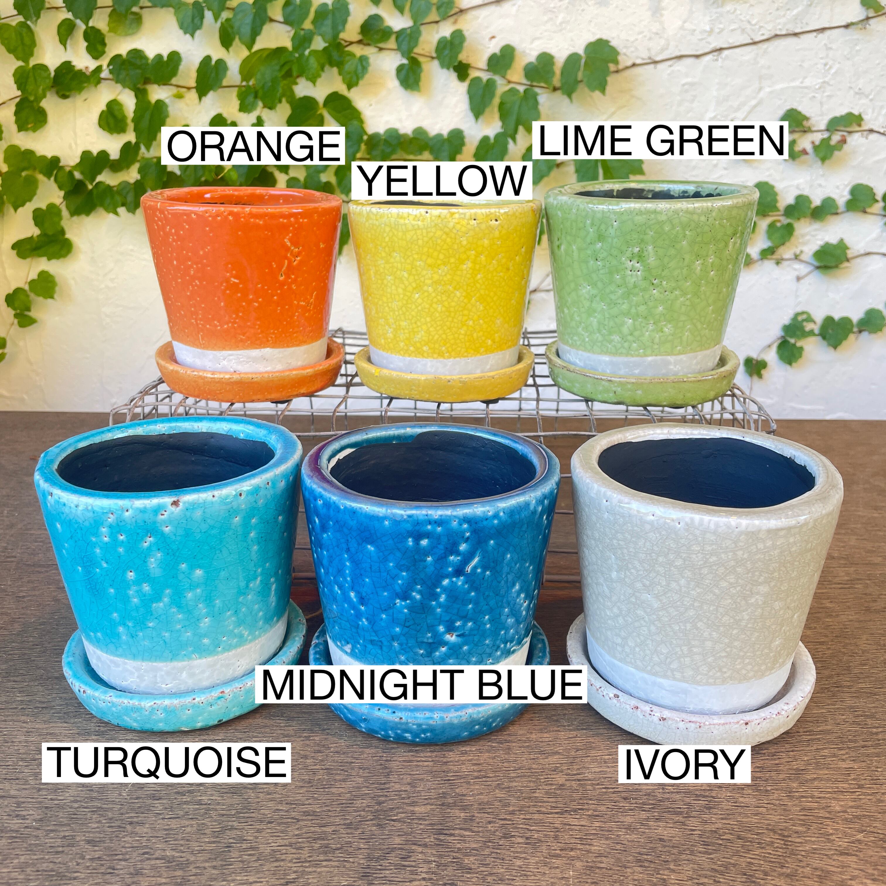 単調な色使いになりがちなガーデニングアイテムも、色とりどりのカラーポットを加えることで華やかな、心浮き立つコーディネートが可能に。屋内のインテリアのポイントにもなります。表面のクラックや色むらも味わい深い、何とも可愛いポット達です。